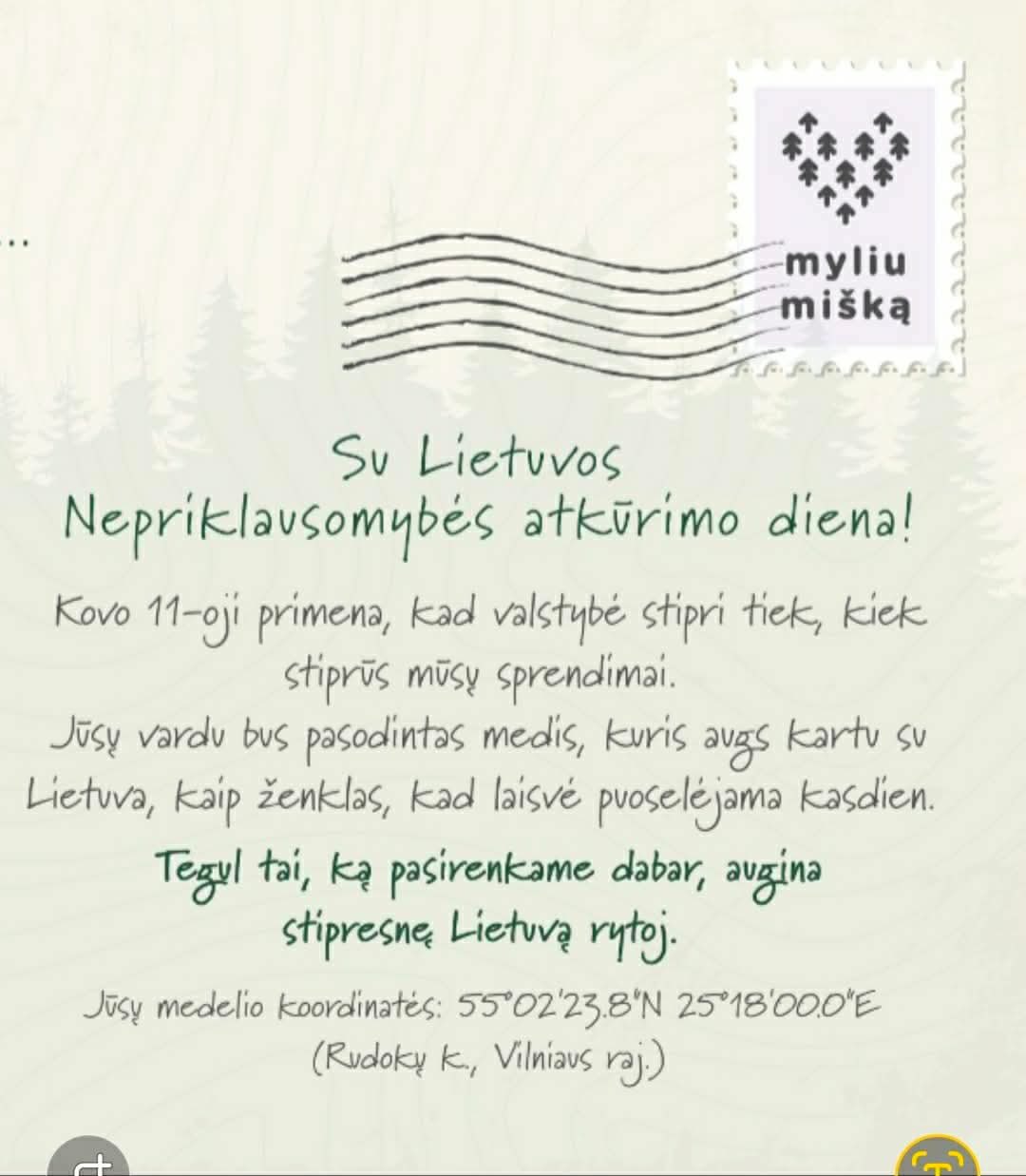 Šią gražią ir saulėtą dieną 1d klasės bendruomenė kartu su mokytoja Inga, sudalyvavo projekte, kurį organizuoja všį „Myliu mišką” ir padovanojome Lietuvai vieną medelį, kuris yra pasodintas klasės vardu ir jau nuo šiandien turi savo tikslias koordinates. Taip prasmingai paminėta ir Kovo 11-oji!