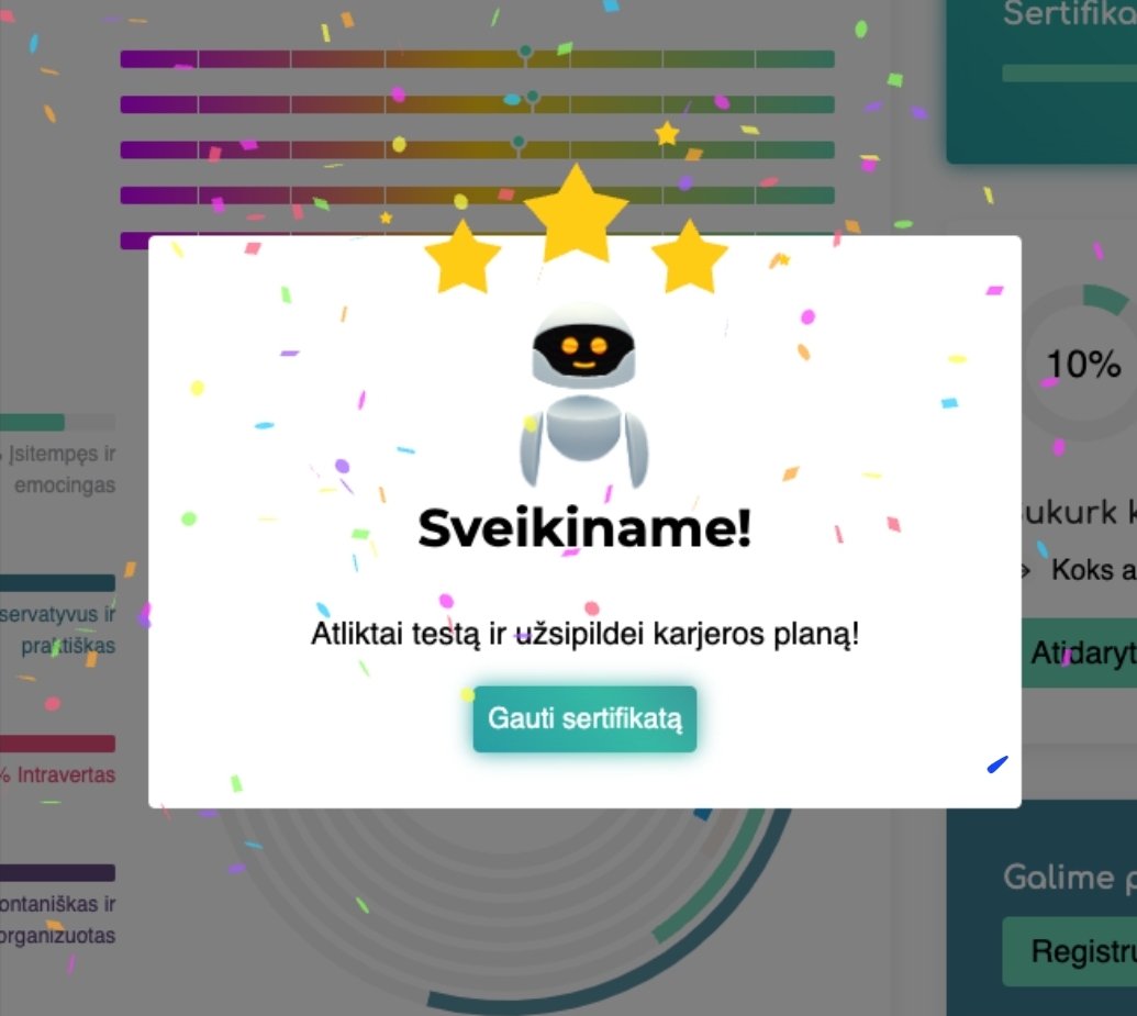 Platformoje asmenybės ir karjeros testą atlikę mokiniai sužinojo savo stipriąsias gebėjimų sritis, dominuojančius asmenybės bruožus ir karjeros polinkius. Po testo laukė individualios užduotys, kurias atlikdami gilino žinias apie save ir susikūrė karjeros planą.