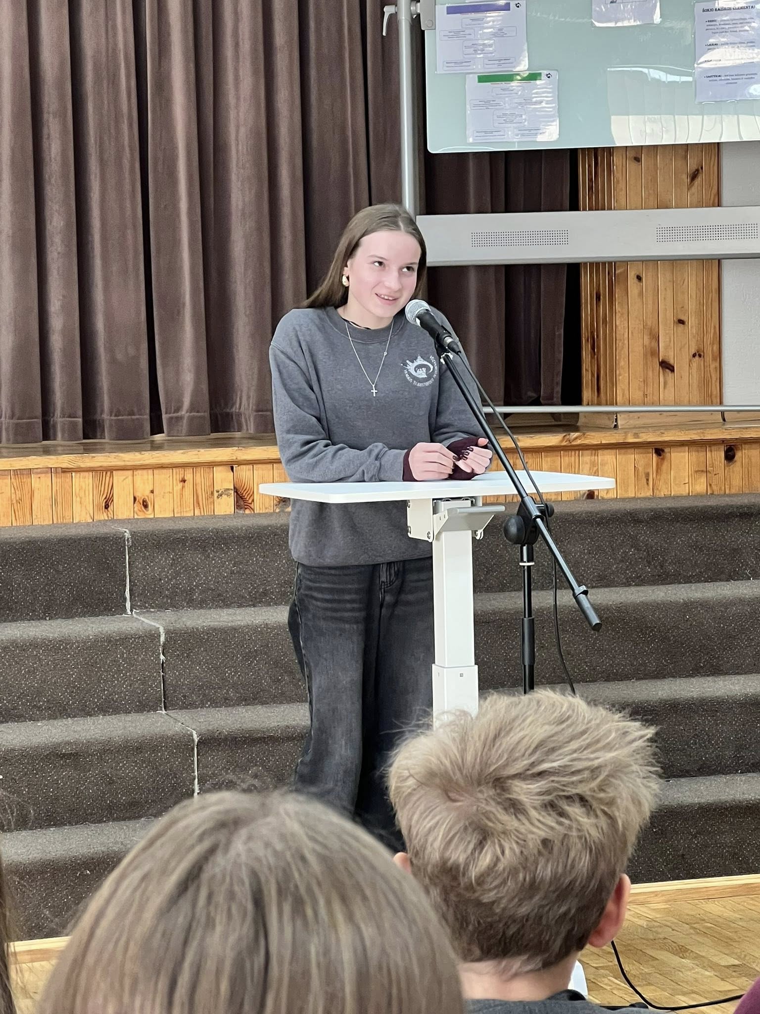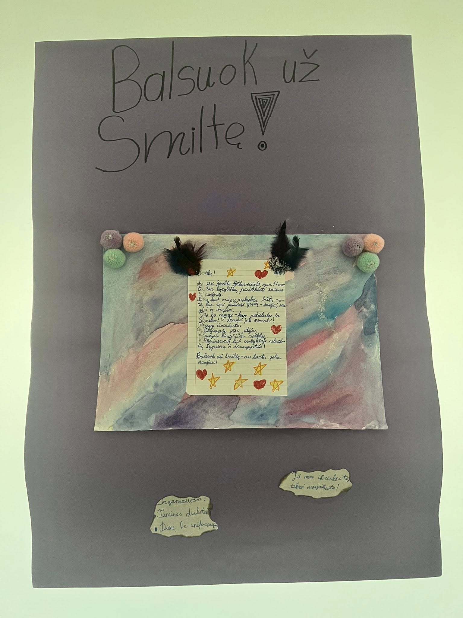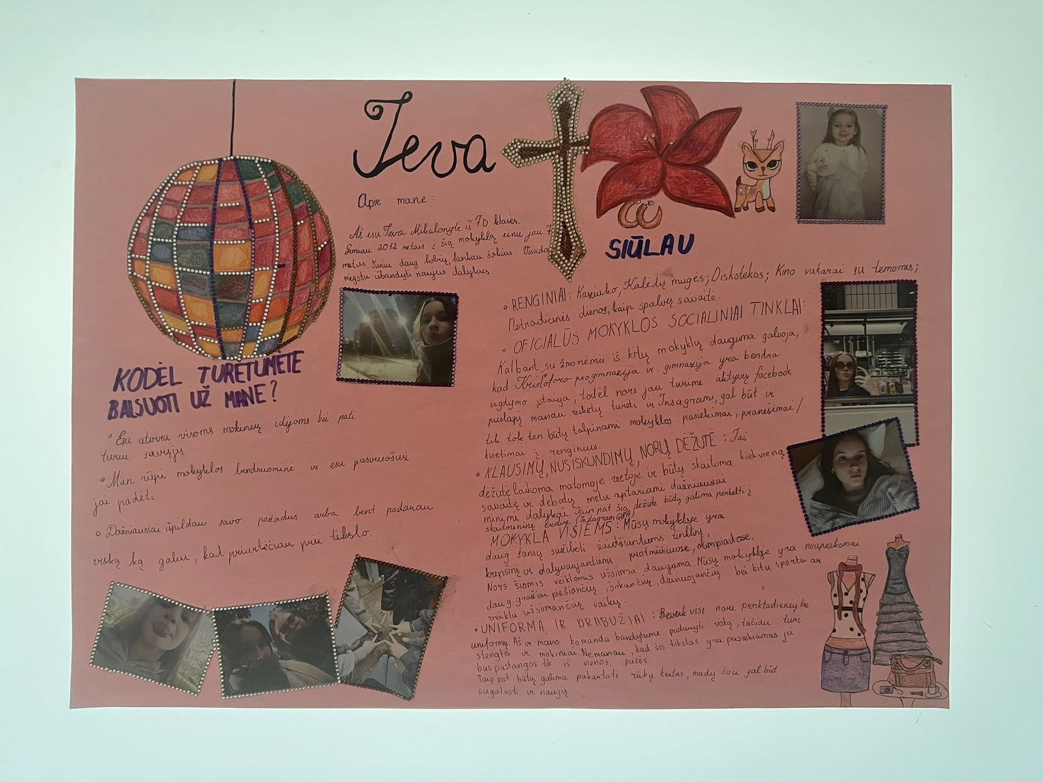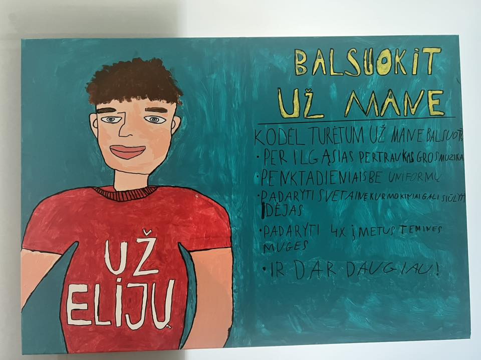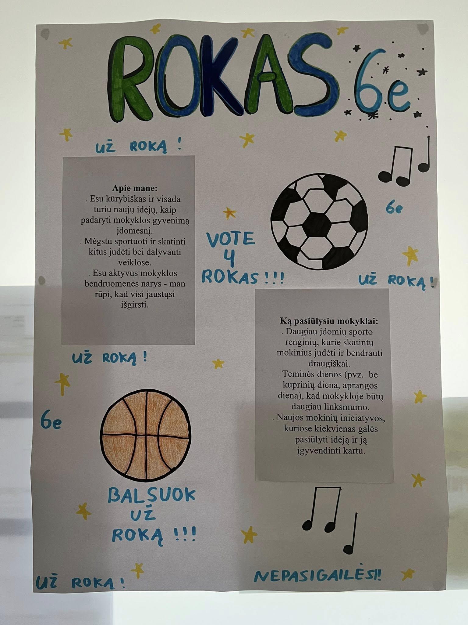 Šią savaitę mūsų progimnazijos mokiniai rinko savo prezidentą. Šiais metais turėjome net 4 kandidatus: 5b klasės mokinė Smiltė, 6e klasės mokinys Rokas, 7a klasės mokinys Elijus, 7d klasės mokinė Ieva ir 8b klasės mokinė Lėja. Kandidatai rinkimams ruošėsi labai atsakingai. Pirmiausia jie turėjo susirinkti mokinių ir mokytojų balsus, kad galėtų kandidatuoti, pasiruošė reklaminius plakatus, dalyvavo debatuose. Vakar įvyko balsavimas ir šiandien jau džiaugiamės turėdami naują prezidentą. Juo tapo 8b klasės mokinė Lėja, vos keliais balsais nuo jos atsiliko būsimas viceprezidentas 5b klasės mokinys Rokas. Džiaugiamės ir linkime Lėjai sėkmės, siekiant išsikeltų tikslų.
