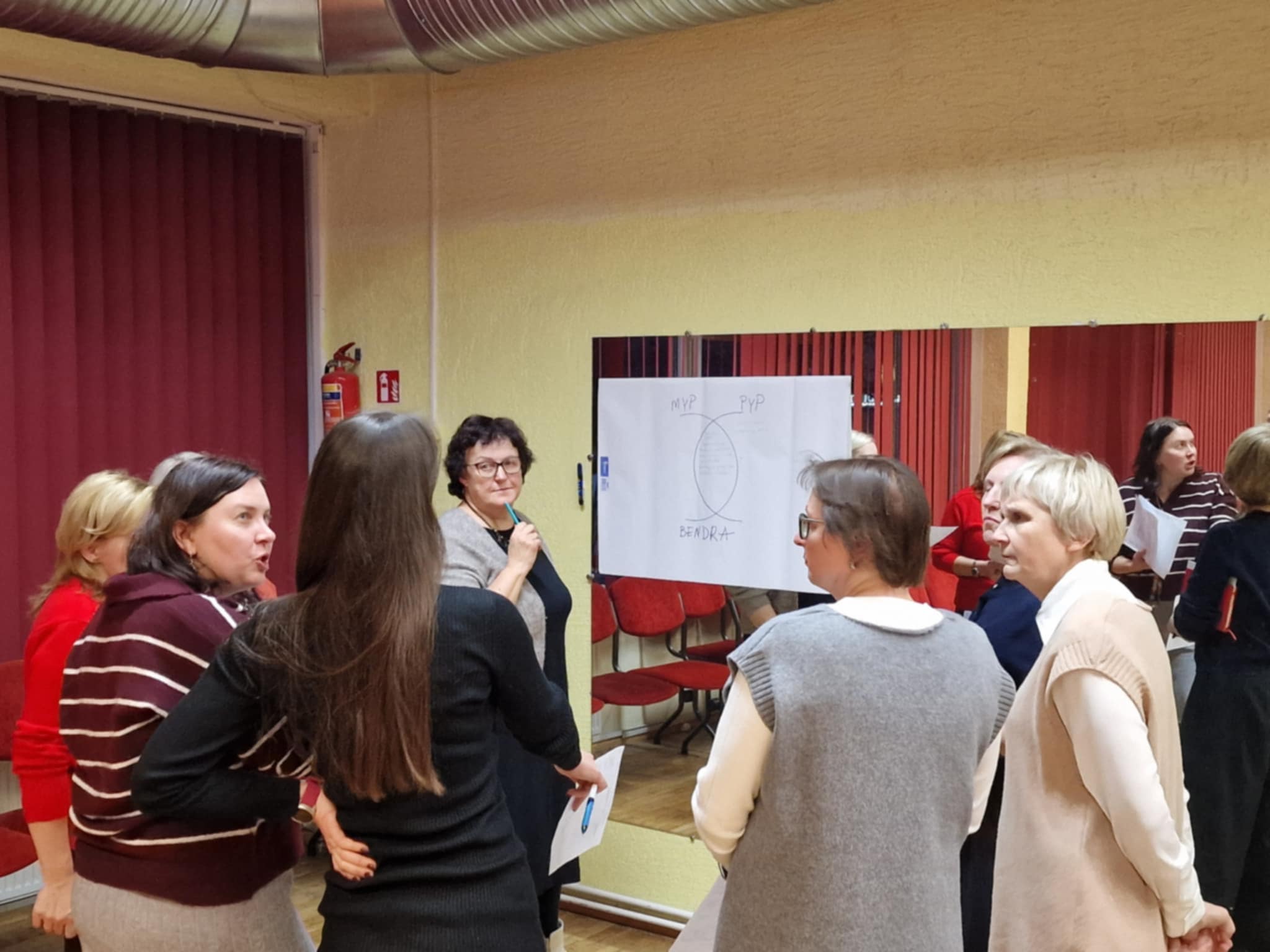 Labai jaukus, produktyvus darbas vyko grupėse. Kolegos pasakojo apie tai, kaip organizuojamas ugdymo procesas, kokie ugdymo metodai padarė įspūdį, kaip įrengtos erdvės, su kokiais iššūkiais susiduria kolegos iš Latvijos. Gyvas pasidalijimas įkvėpė mūsų mokytojus ir dar labiau paskatino veikti.