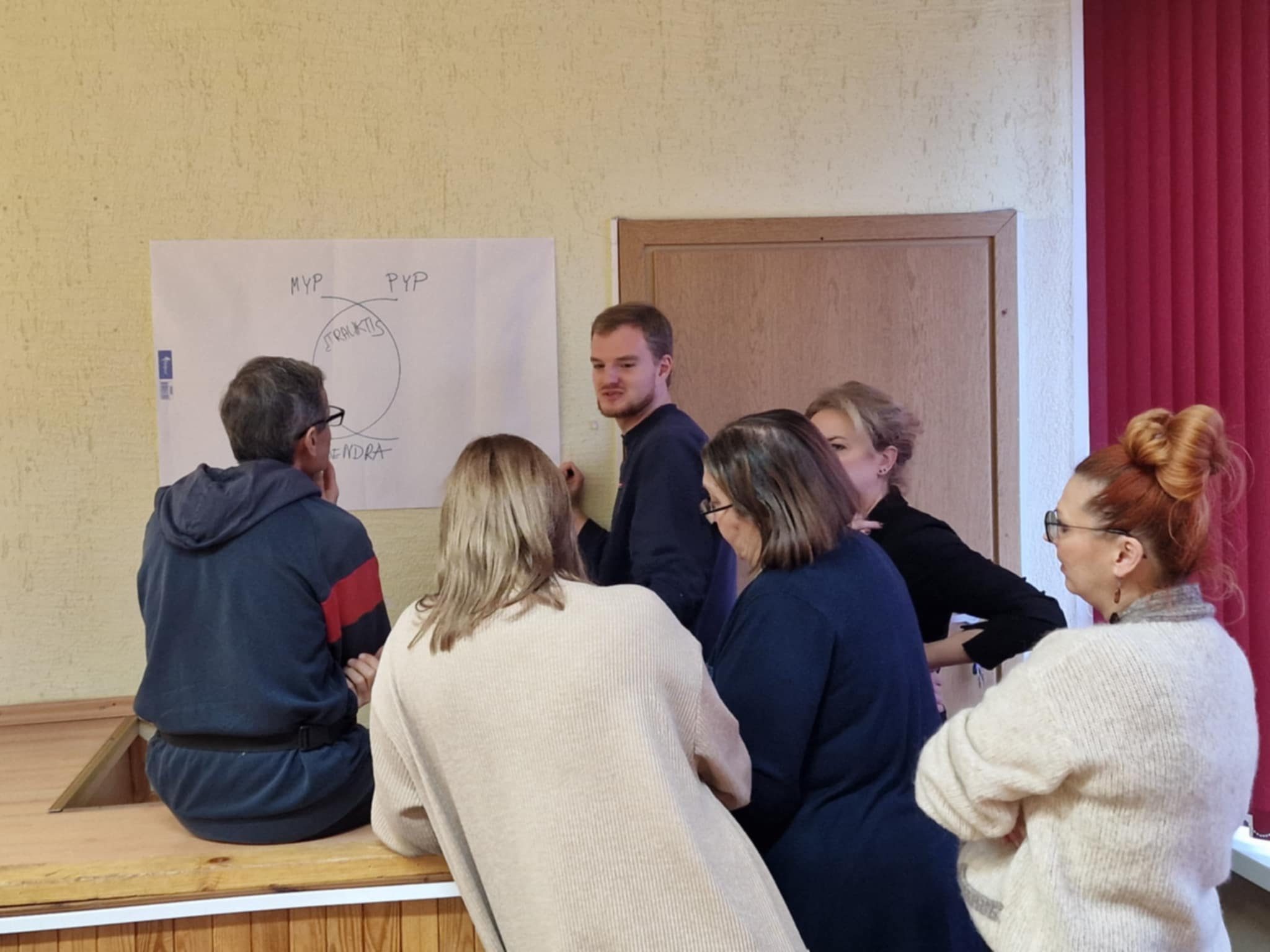 Programos koordinatoriai, pavaduotojai ugdymui Lina Kilčiauskaitė ir Benas Gudinavičius mielai dalijosi savo patirtimi, įgyvendinant IB. Kartu nagrinėjome mokinio profilio savybes (IB Learner Profile), gilinomės į ugdomus įgūdžius (Approaches to Learning-ATL), mokymosi organizavimo svarbiausius aspektus (Approaches to Teaching-ATT), susipažinome su projektine veikla (Exhibition, Community Project-CP). Mūsų pažinimo būdas, kaip ir akcentuoja IB buvo per grupinį darbą ir diskusiją.