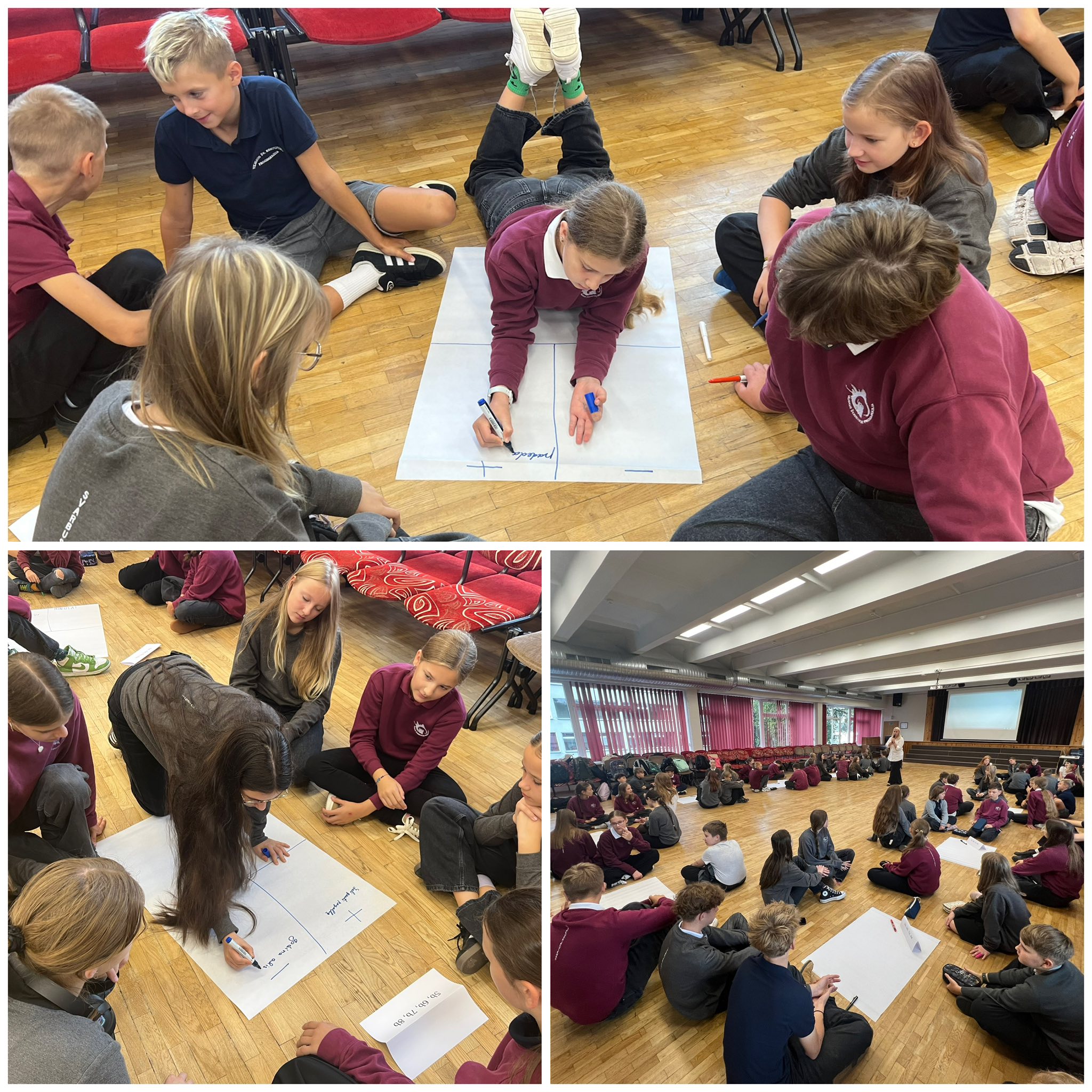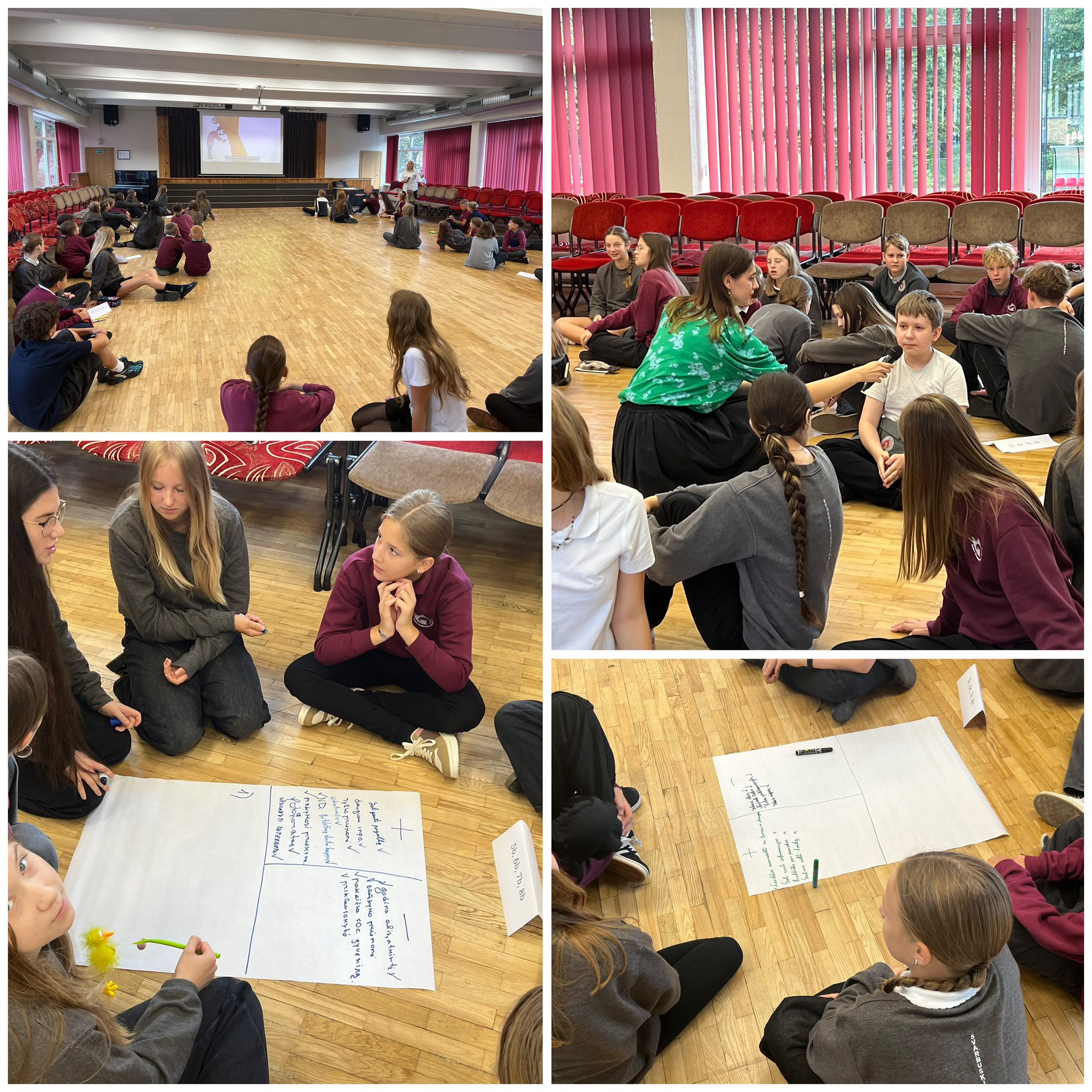 2024 12 04 net 43 savanoriai aštuntokai rinkosi tapti IB ambasadoriais mūsų progimnazijoje. Šiandien su jais „matavomės“ IB mokinio profilio savybes, diskutavome, kokios mokyklos veiklos skatina šių savybių raišką. Įdomu tai, kad aštuntokams labiausiai artimos pasirodė bendravimo ir reflektavimo savybės. Jas didžiausia dalis mokinių pasirinko kaip savo pagrindines savybes. Ieškant, kaip mokykla skatina šių savybių ugdymą, paaiškėjo, kad reflektavimui skiriame išties nemažai dėmesio per pamokas, pildant asmeninius segtuvus, aptariant neformalias veiklas. Bendravimo įgūdžių ugdymą mokiniai atpažino grupiniuose darbuose, projektinėje veikloje.